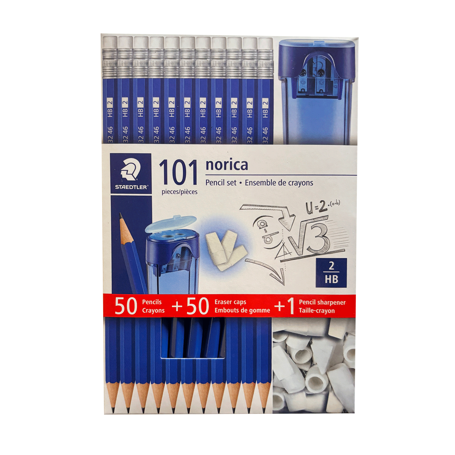 STAEDTLER Norica Pencil Set: 50 Pre-sharpened #2 HB Pencils with 50 Eraser Caps & Double-Hole Sharpener, Break-Resistant Lead, School Pack